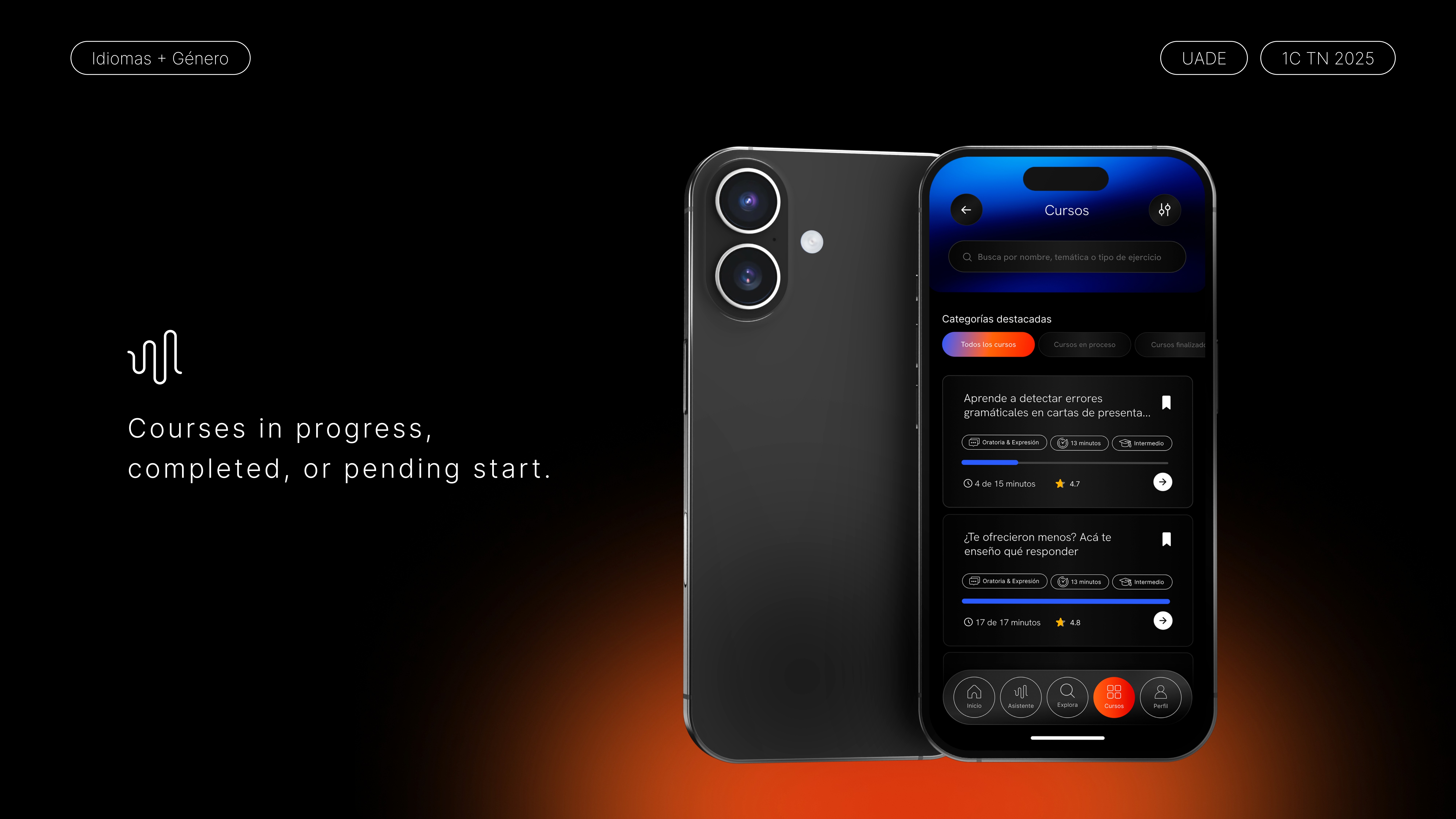 A mobile app designed to help Spanish-speaking women overcome the fear of using a second language in professional settings. Not just learn it, but actually feel ready to use it. The project started with a real insight: many people study English for years but still freeze when it comes to job interviews, salary negotiations, or client presentations. Aura addresses that gap by combining personalized courses, an AI-powered virtual assistant, and gamified exercises; all tailored to the user's specific profession and goals. I led the end-to-end design process: from research and ideation, through feature prioritization and MVP definition, to wireframing, UI design, prototyping, and usability testing. The visual direction leans into a bold, dark aesthetic with vibrant gradients, intentionally stepping away from the typical pastel, friendly tone of most learning apps to feel more professional and aspirational.